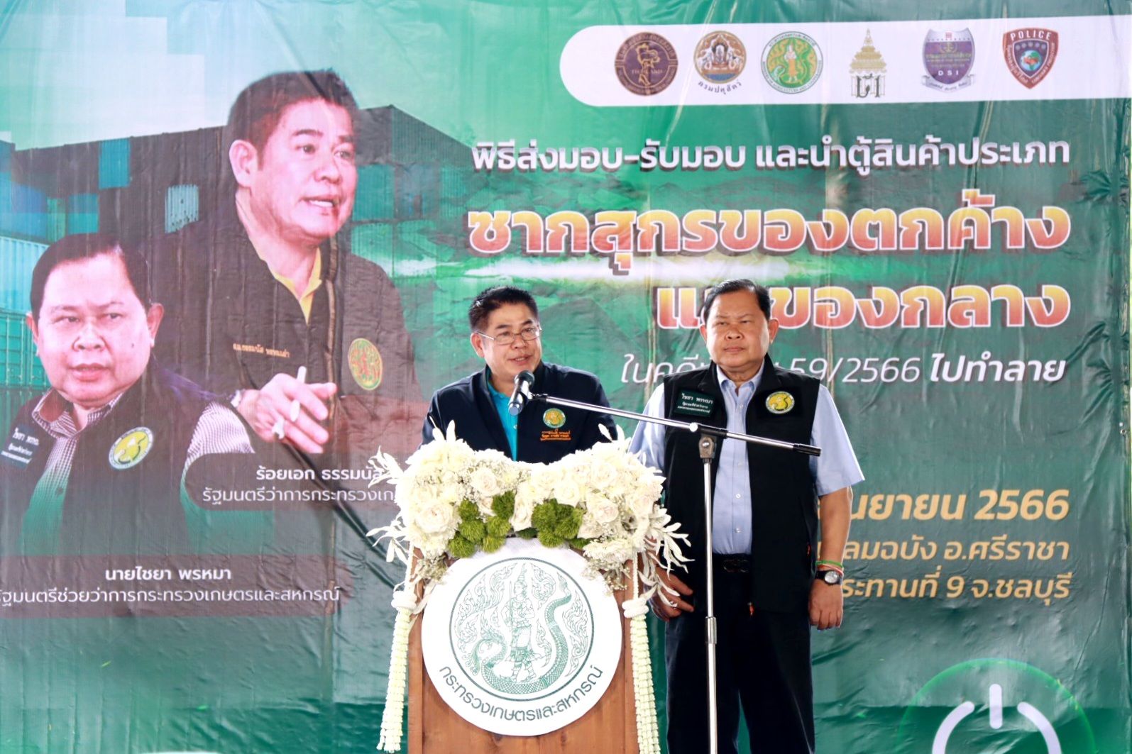 จากนั้น รัฐมนตรีว่าการกระทรวงเกษตรฯ และคณะ ได้เดินทางไปยังสำนักชลประทานที่ 9 ตำบลบางพระ อำเภอศรีราชา จังหวัดชลบุรี เพื่อ KICK OFF เผาทำลายซากสุกรของกลางฯ ชุดแรกจำนวน 10 ตู้คอนเทนเนอร์ โดยวิธีการเผาในเตาเผาระบบปิด เพื่อป้องกันการแพร่กระจายของเชื้อโรคและไม่ส่งผลกระทบต่อสิ่งแวดล้อม สำหรับของกลางส่วนที่เหลือจะทยอยนำไปทำลายเป็นชุด ๆ ด้วยการฝังกลบที่จังหวัดสระแก้วจนครบ 161 ตู้คอนเทนเนอร์ตามที่ได้วางแผนไว้ ซึ่งได้ปฏิบัติตามขั้นตอนที่ถูกต้องตามมาตรฐานขององค์การสุขภาพสัตว์โลก (OIE) และดำเนินการด้วยความโปร่งใส เป็นไปตามกฎหมาย และตรวจสอบได้ต่อไป