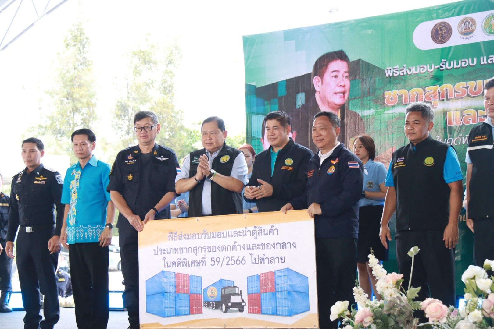 วันศุกร์ที่ 29 กันยายน พ.ศ. 2566 เวลา 08.00 น. นายปราโมทย์ ยาใจ อธิบดีกรมพัฒนาที่ดิน พร้อมด้วย นายอนุวัชร โพธินาม รองอธิบดีกรมพัฒนาที่ดินด้านปฏิบัติการ ร่วมพิธีส่งมอบ-รับมอบ และนำตู้สินค้าประเภทซากสุกรของตกค้างและของกลาง ในคดีพิเศษที่ 59/2566 จำนวน 161 ตู้คอนเทนเนอร์ ไปทำลาย ณ ท่าเรือแหลมฉบัง จังหวัดชลบุรี โดยมี ร้อยเอก ธรรมนัส พรหมเผ่า รัฐมนตรีว่าการกระทรวงเกษตรและสหกรณ์ เป็นประธาน ทั้งนี้ กระทรวงเกษตรและสหกรณ์ ได้มีนโยบายกำหนดมาตรการประกาศสงครามกับสินค้าเกษตรเถื่อน มุ่งปราบปรามการลักลอบนำเข้าสินค้าเกษตรด้านพืช ประมง และปศุสัตว์ที่ผิดกฎหมายอย่างเข้มงวด โดยบูรณาการกับหน่วยงานที่เกี่ยวข้อง และมีประกาศคำสั่งแต่งตั้งคณะกรรมการบริหารแก้ไขปัญหาการนำเข้าและส่งออกสินค้าเกษตรที่ผิดกฎหมาย เมื่อวันที่ 21 กันยายน พ.ศ. 2566 เพื่อแก้ไขปัญหาที่ทำให้เกษตรกรเดือดร้อน ผลผลิตตกต่ำ ทั้งด้านพืช ประมง และปศุสัตว์ รวมถึงการหลอกลวง สินค้าผิดกฎหมายต่าง ๆ ซึ่งได้ประกาศการขับเคลื่อนยุทธการปราบปรามการลักลอบนำเข้า-ส่งออก สินค้าเกษตรผิดกฎหมายไปเมื่อวันที่ 25 กันยายน ที่ผ่านมา และในวันนี้กระทรวงเกษตรฯ ได้รับมอบตู้สินค้าของกลางฯ จำนวน 161 ตู้คอนเทนเนอร์ จำนวน 4.3 ล้านกิโลกรัม มูลค่ากว่า 567 ล้านบาท จากกรมศุลกากรเป็นที่เรียบร้อยแล้ว จากนี้จะดำเนินการทำลายของกลางฯ ดังกล่าวทิ้งเพื่อเป็นการสร้างความมั่นใจและเรียกความเชื่อมั่นจากผู้เลี้ยงสุกร ผู้ประกอบการ และผู้บริโภค และเพื่อไม่ให้เกิดผลกระทบต่อภาคเกษตรต่อไปในอนาคต