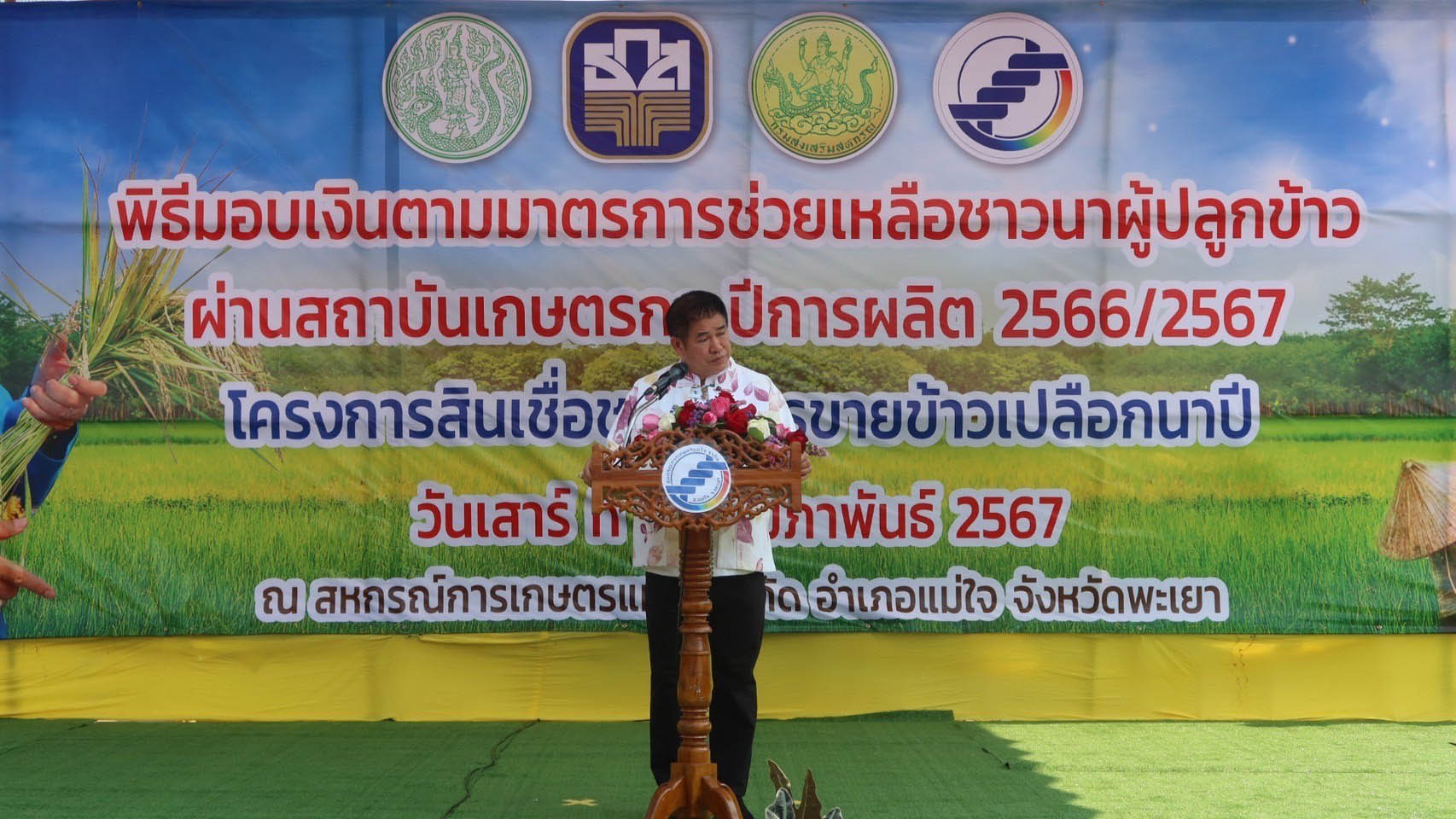 วันเสาร์ที่ 17 กุมภาพันธ์ พ.ศ. 2567 เวลา 10.30 น. ดร.อาทิตย์ ศุขเกษม รองอธิบดีกรมพัฒนาที่ดินด้านวิชาการ พร้อมด้วยนางมนัสนันท์ ไชยนุรัตน์ ผู้อำนวยการสถานีพัฒนาที่ดินพะเยา นายปริญญานนท์ ทองคำ ผู้อำนวยการสถานีพัฒนาที่ดินเชียงราย นายสุรเชษฐ์ นราภัทร ผู้อำนวยการกลุ่มวิจัยกายภาพดิน และข้าราชการในสังกัด ร่วมพิธีมอบเงินตามมาตรการ การช่วยเหลือชาวนาผู้ปลูกข้าว ผ่านสถาบันเกษตรกร ปีการผลิต 2566/2567 ตามโครงการสินเชื่อชะลอการขายข้าวเปลือกนาปี โดยมี ร้อยเอกธรรมนัส พรหมเผ่า รัฐมนตรีว่าการกระทรวงเกษตรและสหกรณ์ เป็นประธานเปิดงาน ณ สหกรณ์การเกษตรแม่ใจ จำกัด อำเภอแม่ใจ จังหวัดพะเยา