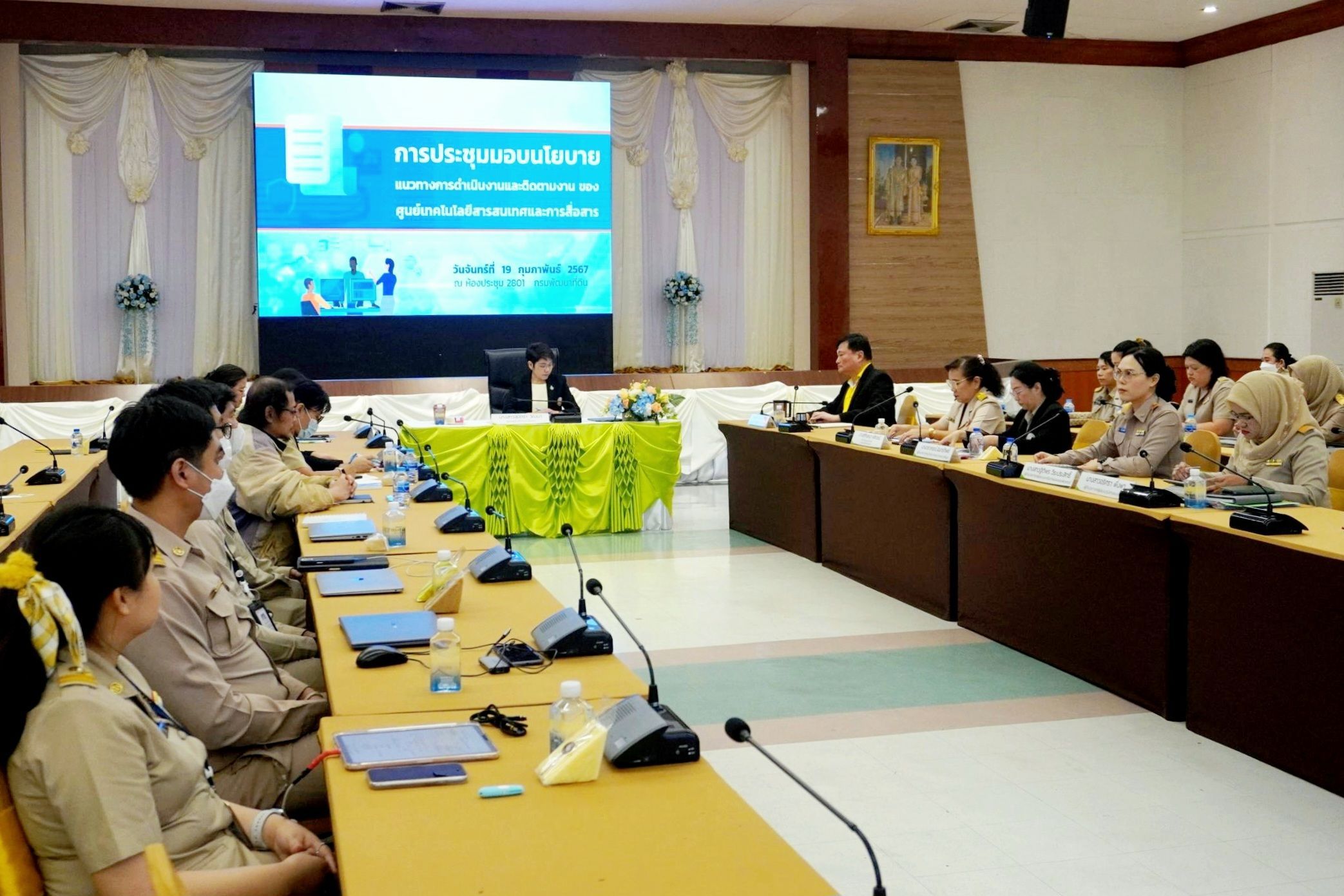 วันจันทร์ที่ 19 กุมภาพันธ์ พ.ศ. 2567 เวลา 09.30 น. ดร.สุมิตรา วัฒนา รองอธิบดีกรมพัฒนาที่ดินด้านบริหาร เป็นประธานการประชุมมอบนโยบายแนวทางการดำเนินงาน พร้อมติดตามผลการดำเนินงานของศูนย์เทคโนโลยีสารสนเทศและการสื่อสาร เพื่อขับเคลื่อนการดำเนินงานให้บรรลุเป้าหมายตามนโยบายกรมพัฒนาที่ดิน กระทรวงเกษตรและสหกรณ์ รวมทั้งแผนปฏิบัติการดิจิทัลของกรมพัฒนาที่ดิน ให้ประสบความสำเร็จและมีประสิทธิภาพ โดยมีนายอัธยะ พินจงสกุลดิษฐ ผู้อำนวยการศูนย์เทคโนโลยีสารสนเทศและการสื่อสาร พร้อมด้วยผู้เชี่ยวชาญ ผู้อำนวยการกลุ่ม หัวหน้าฝ่าย ข้าราชการ และเจ้าหน้าที่ ให้การต้อนรับ ณ ห้องประชุม 2801 อาคาร 2 กรมพัฒนาที่ดิน กรุงเทพฯ
