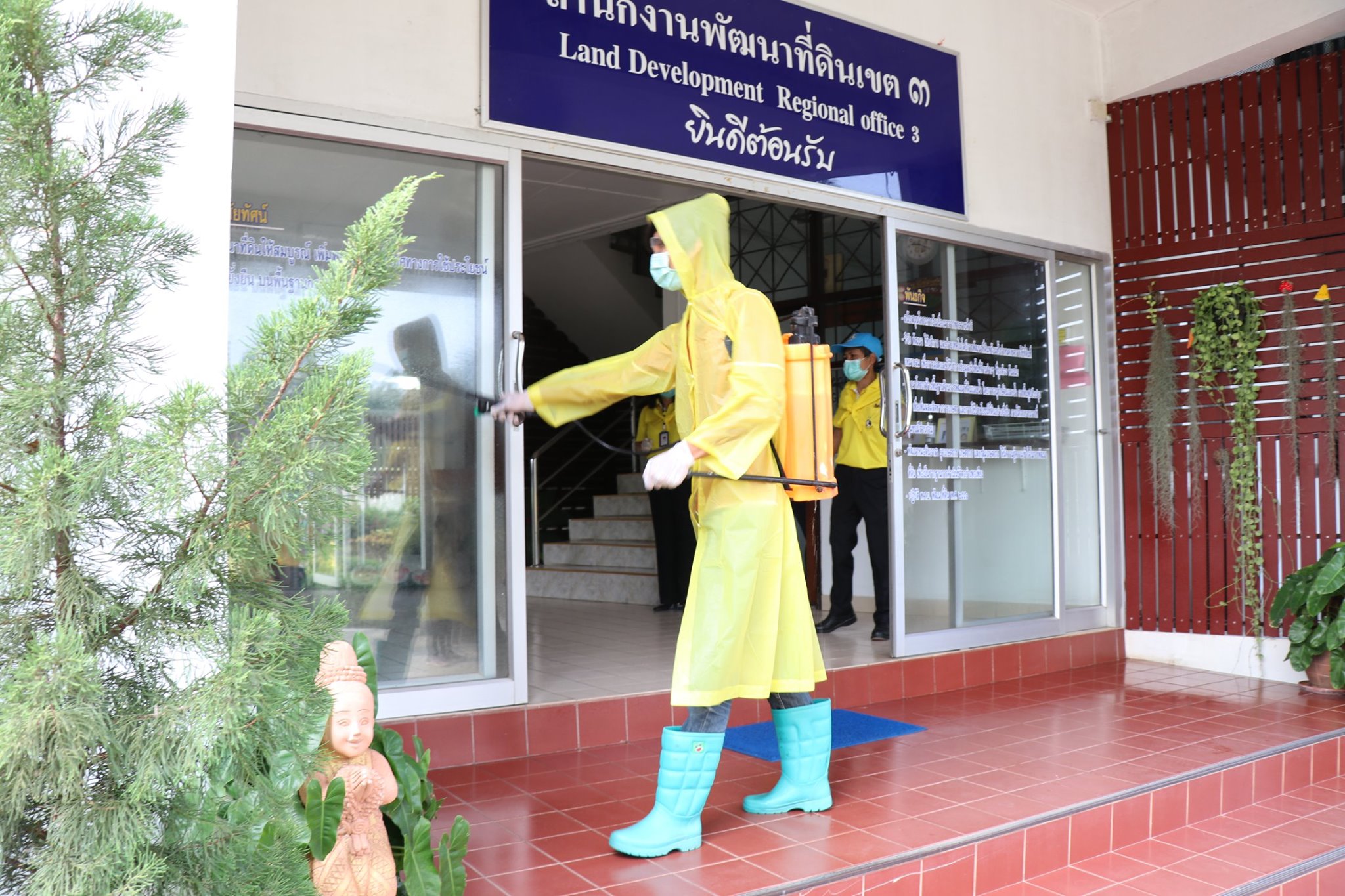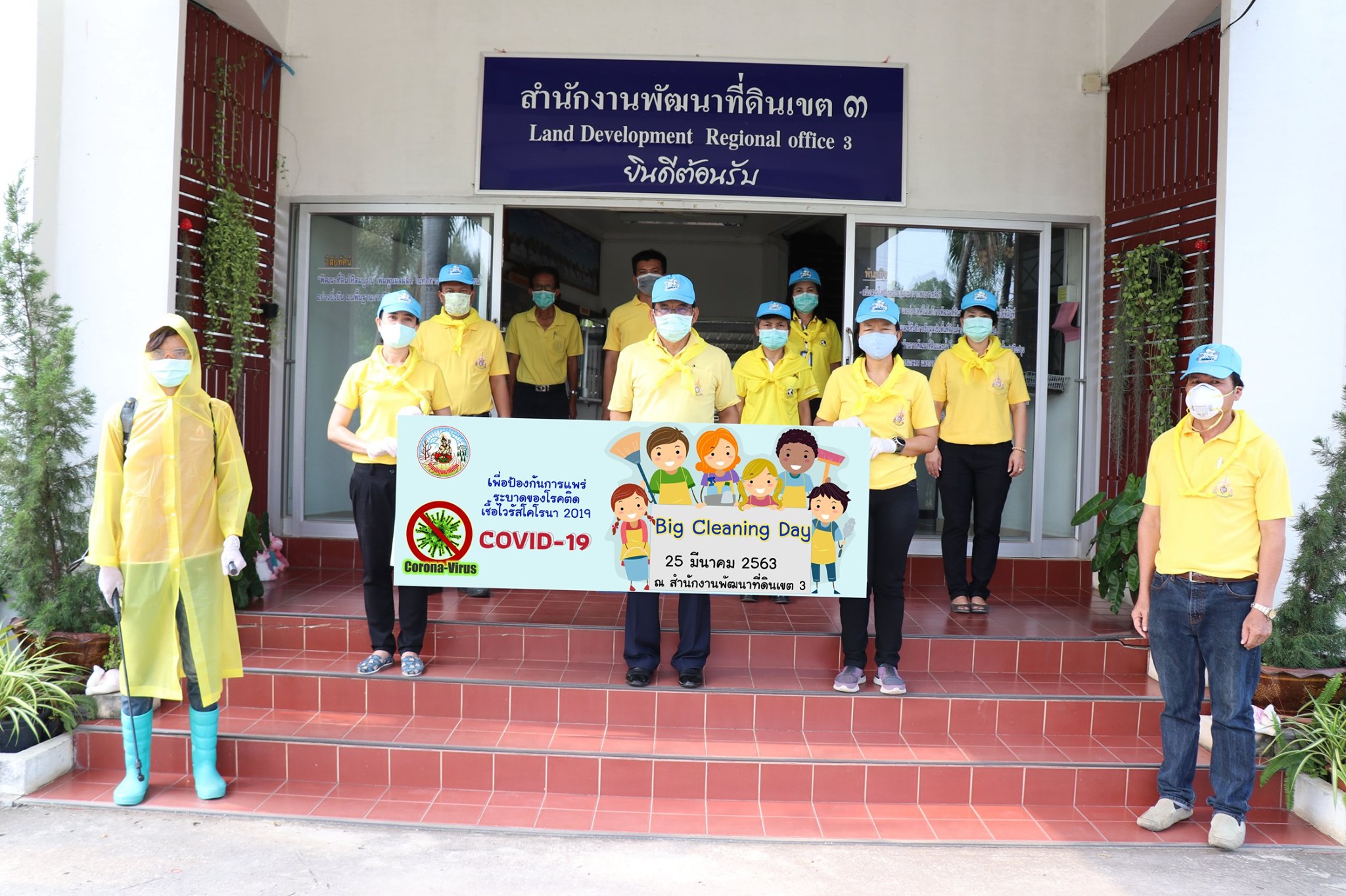 วันพุธที่ 25 มีนาคม พ.ศ. 2563 เวลา 09.00 น.นายศรจิตร ศรีณรงค์ ผู้อำนวยการสำนักงานพัฒนาที่ดินเขต 3 พร้อมด้วย นางสาวเสาวนีย์ ประจันศรี รักษาการในตำแหน่งผู้เชี่ยวชาญด้านวางระบบการพัฒนาที่ดิน นายจักรพันธ์ เภาสระคู ผู้อำนวยการกลุ่มวิชาการเพื่อการพัฒนาที่ดิน พร้อมด้วย ผู้อำนวยการกลุ่มวางแผนการใช้ที่ดิน ผู้อำนวยการกลุ่มวิเคราะห์ดิน ผู้อำนวยการกลุ่มสำรวจและทำแผนที่ หัวหน้าฝ่ายบริหารทั่วไป นำข้าราชการ และเจ้าหน้าที่สำนักงานพัฒนาที่ดินเขต 3 ดำเนินกิจกรรม Big Cleaning Day เพื่อป้องกันการแพร่ระบาดของโรคติดเชื้อไวรัสโคโรนา 2019 (COVID-19) โดยการทำความสะอาดอาคาร บริเวณโดยรอบ และบริเวณที่อาจมีการปนเปื้อนหรือบริเวณที่มีการสัมผัสบ่อยครั้งซึ่งอาจเป็นแหล่งที่มีการแพร่กระจายเชื้อโรค ได้แก่ โถส้วม โถปัสสาวะ สายฉีดชำระ กลอน หรือลูกบิดประตู ฝารองนั่ง ฝาปิดชักโครก ก๊อกน้ำ อ่างล้างมือ ณ อาคารที่ตั้งของแต่ละกลุ่ม/ฝ่าย เพื่อให้สอดคล้องกับมาตรการเฝ้าระวัง ป้องกัน และเตรียมความพร้อมในการรองรับสถานการณ์การแพร่ระบาดของโรคติดเชื้อไวรัสโคโรนา 2019 (COVID-19) ของกรมพัฒนาที่ดิน และเจ้าหน้าที่สำนักงานพัฒนาที่ดินเขต 3 ได้ถือปฏิบัติตามแนวทางประกาศของรัฐบาลหรือกระทรวงสาธารณสุขอย่างเคร่งครัด