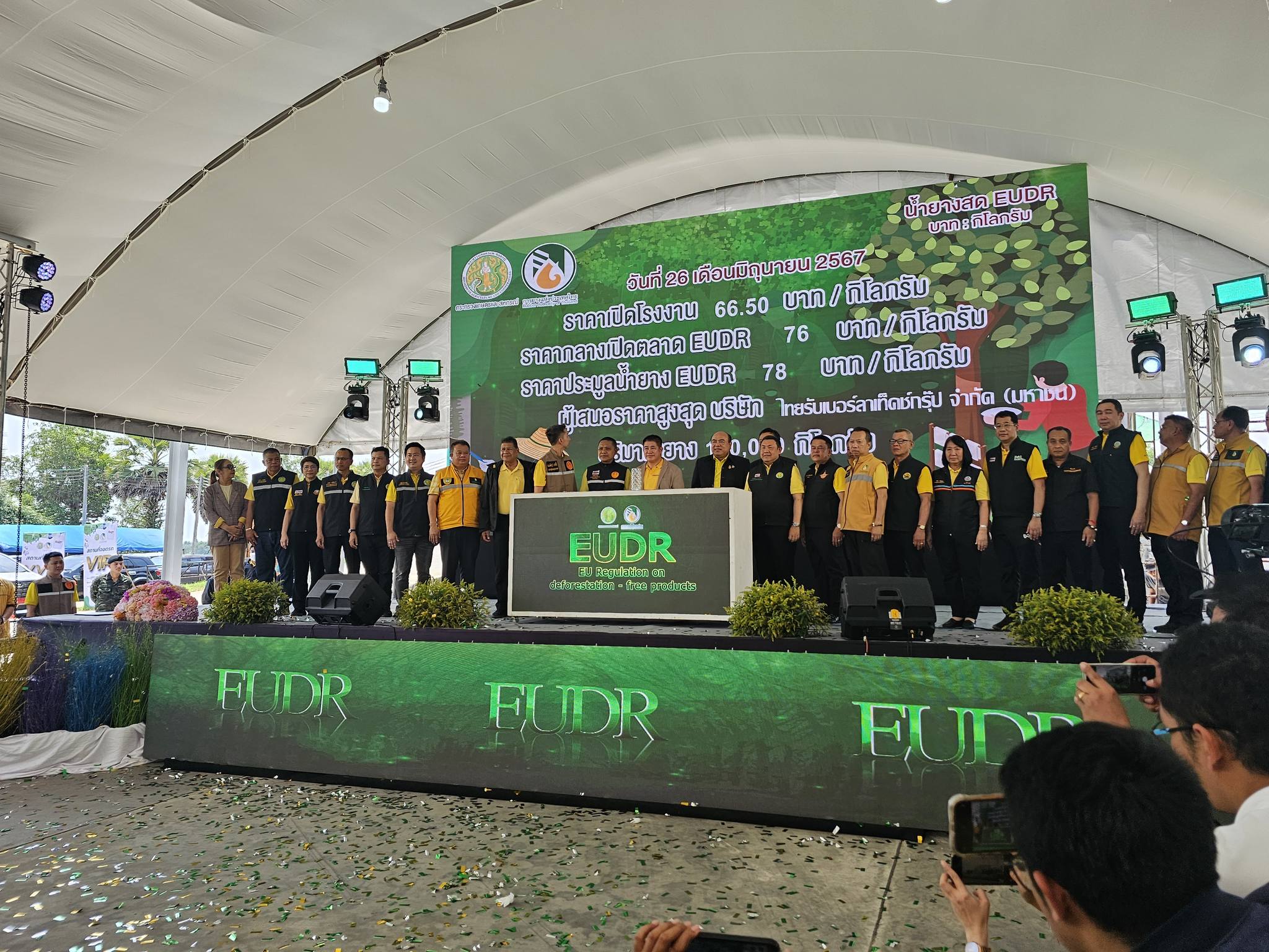 วันพุธที่ 26 มิถุนายน พ.ศ. 2567 เวลา 10.00 น. ร้อยเอก ธรรมนัส พรหมเผ่า รัฐมนตรีว่าการกระทรวงเกษตรและสหกรณ์ เป็นประธาน Kick Off โครงการบูรณาการทดลองร่วมกันระหว่างภาคเอกชนกับเกษตรกร เพื่อแก้ปัญหาโรคใบร่วงชนิดใหม่ในยางพารา และการซื้อขายน้ำยาง EUDR จัดขึ้นโดยการยางแห่งประเทศไทย โดย นางสาวสุมิตรา วัฒนา รองอธิบดีกรมพัฒนาที่ดิน พร้อมด้วยข้าราชการและเจ้าหน้าที่สำนักงานพัฒนาที่ดินเขต 12 ร่วม Kick Off ณ โรงงานน้ำยางข้นสหกรณ์การเกษตรจะนะจำกัด อำเภอจะนะ จังหวัดสงขลา โดยนายอภิชาติ สาราบรรณ์ รองผู้ว่าราชการจังหวัดสงขลา กล่าวต้อนรับ และนายณกรณ์ ตรรกวิรพัท ผู้ว่าการยางแห่งประเทศไทย กล่าวรายงานผลการดำเนินงาน ภายในงานมีผู้บริหารและหน่วยงานราชการในสังกัดกระทรวงเกษตรและสหกรณ์ ภาคเอกชน ผู้นำชุมชน หมอดินอาสา เกษตรกร และประชาชนเข้าร่วมงาน